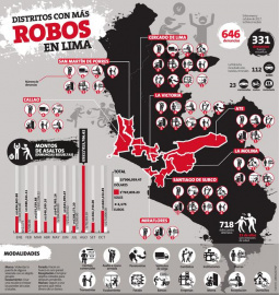 Los asaltos en Lima están en aumento y no hay distrito en Lima en que no haya los asaltos, miembros de la policía advierten que el porcentaje en la ciudad incremento en un 60%. Ellos están en todos lados, a toda hora, y es que –según la Policía Antirrobos–  los asaltos se incrementan en un 60% en la capital.Así lo advirtió el Coronel PNP César Vallejos Mori, jefe de la División de Investigación de Robos de la Dirincri, quien detalló que la razón es  el incremento del movimiento financiero que hace el público para adquirir todo tipo de productos. “Los delincuentes tratan de ‘asegurar’ su Navidad. Salen en busca de dinero. Ellos se aseguran de ganar siempre, ya sea dinero en efectivo o en especies. Para conseguirlo, estos no miden el grado de violencia”, señaló. MODALIDADES MÁS USADAS Las modalidades más empleadas por las organizaciones criminales en esta temporada son el ‘raqueteo’, ‘marcaje’, robo en viviendas y los falsos taxistas. En el modus operandi en el que se ejerce mayor violencia es en el ‘raqueteo’. Los criminales operan armados en modernos autos y en motos, y recorren las calles de la ciudad en busca de distraídas víctimas. “El delincuente sabe que una persona joven o adulta lleva entre sus pertenencias un celular, una billetera y, por estas fechas, más dinero. En estos casos, los ladrones no buscan un millonario botín”, precisó el Coronel. Sostuvo que este tipo de robos se comete tanto en distritos residenciales como en los Conos de la capital. En el primer caso, los maleantes atacan en calles desoladas y en horas de la noche; mientras que en los conos, los atracos se pueden dar en cualquier lugar y a cualquier hora.
